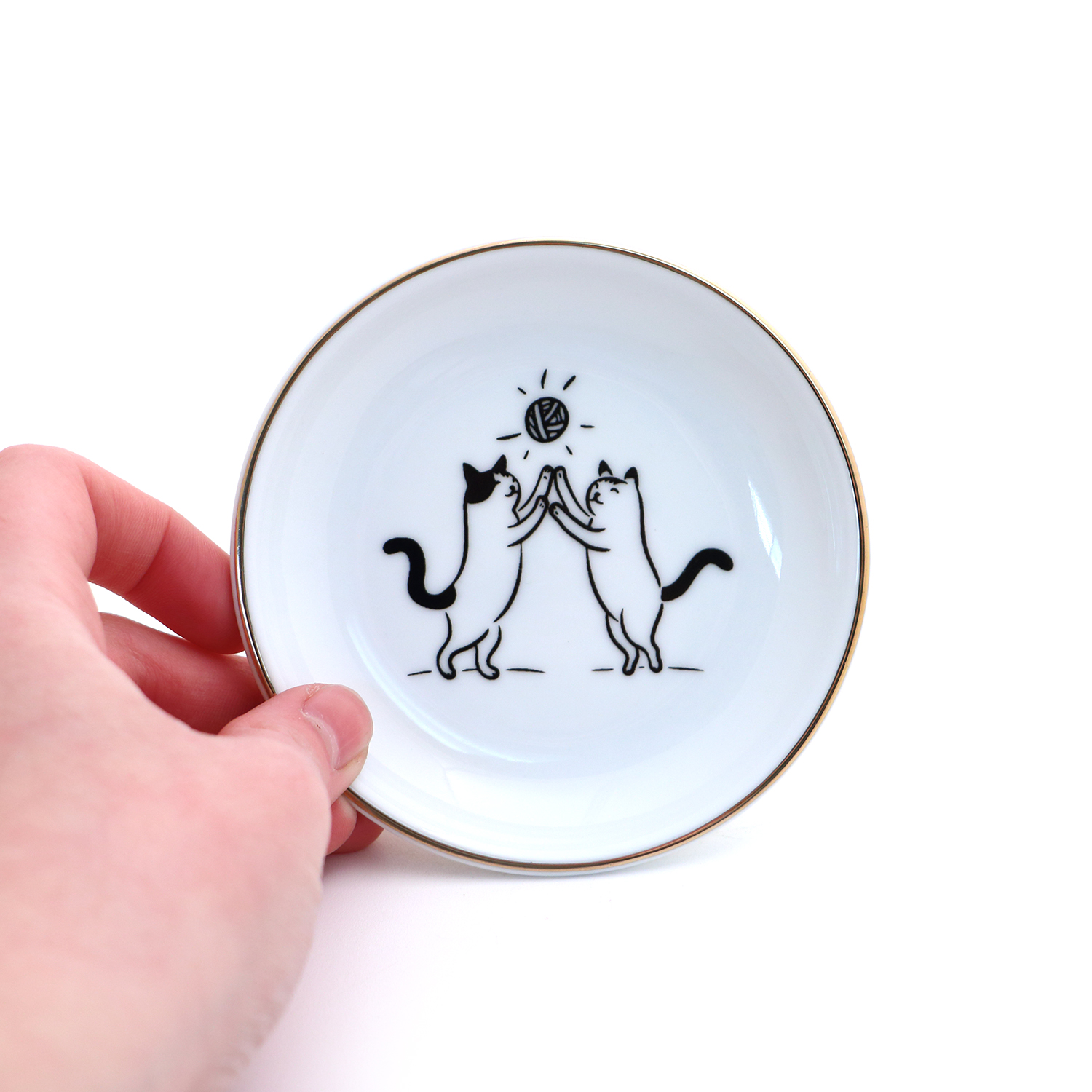 This handmade ring holder features two happy cats dancing beneath a yarn ball sun. This small round dish is the perfect place to keep rings or other trinkets while busy working. Created from porcelain clay with a rim of 22K gold and kiln fired numerous times. This small dish measures 4 x 4. Great gift for a crafty cat lover.