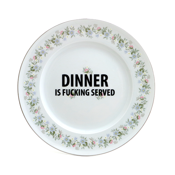 This funny plate reads Dinner is Fucking Served. This vintage plate is upcycled, we have restored its finish using all non toxic lead free glazes before adding our design and kiln firing it a final time. This item is food safe--it is made to be used and enjoyed on a daily basis, but because of gold accents should not be placed in the microwave. Standard dinner plate size 10.5 inches. Makes a funny addition to any kitchen gallery wall or dinner table.
