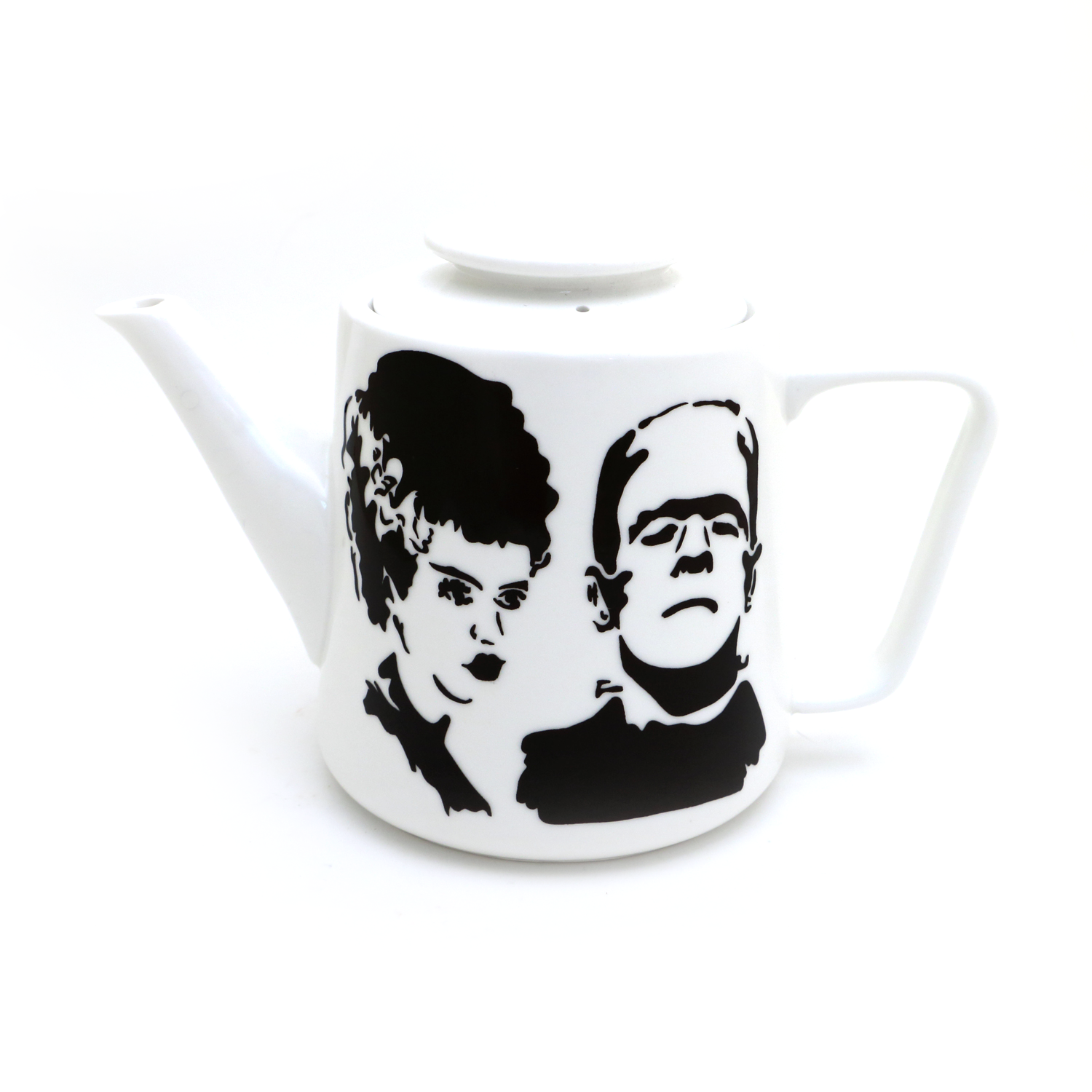 Frankenstein monster and the Bride of Frankenstein teapot. Back reads: Made for each other. This teapot is created from porcelain clay, kiln fired to over 1900 degrees. All lead free, non toxic, eco-friendly materials were used. This teapot was made to serve and brew tea- please do not place on stove top or open flame. Safe to dishwash and microwave. It has an interior strainer created by piercings in the wall before the spout, so can be used with loose tea leaves. Lid has lock feature for extra safety when pouring. This large teapot measures 6 inches high by x 9 inches spout to handle- Holds 4-5 cups. Great gift for a monster or horror fan, film buff or lover of tea.