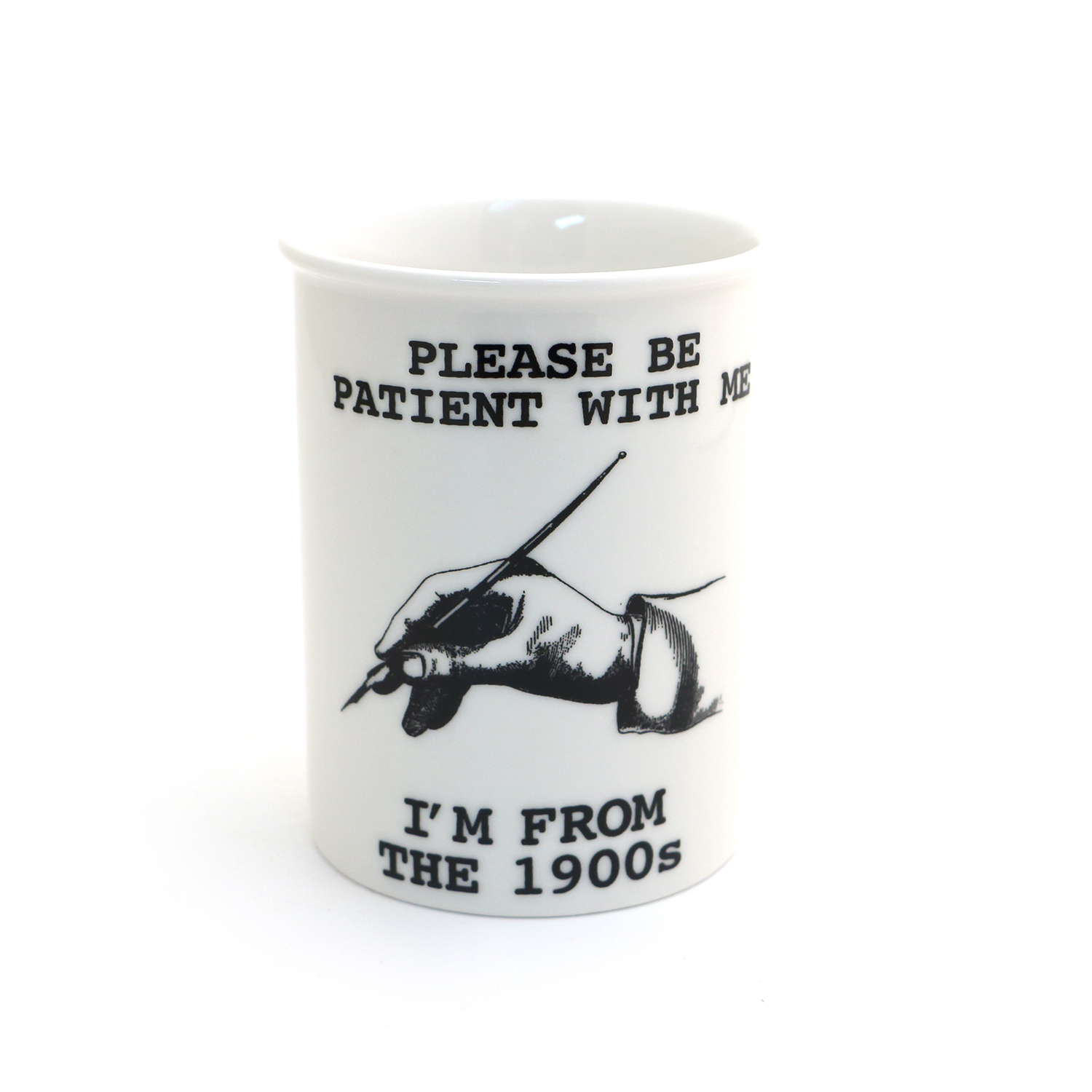 This funny ceramic pen and pencil cup reads Please Be patient with me, I'm from the 1900s. Handmade from bone china clay, kiln fired. It measures 4.25 inches high by 3.5 inches wide and holds a generous amount of writing implements or brushes. Great gift for an artist or writer and fun addition to any desk. Perfect birthday gift for a Gen X, Boomer, or Millennial.