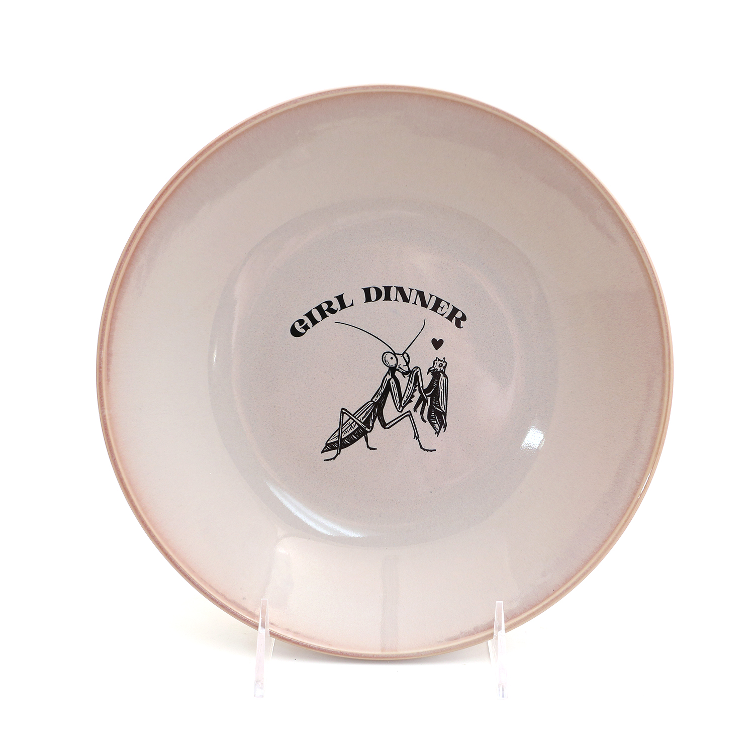 Girl Dinner snack bowl. This ceramic bowl is glazed a soft pink and is the perfect gift for a female friend who likes food! Created from stoneware clay and featuring a everyone's favorite feminist Praying Mantis about to partake of her favorite snack. It measures 9 x 2 inches and is dishwasher and microwave/oven safe. Made to be used and enjoyed! Great popcorn or ice cream bowl!
