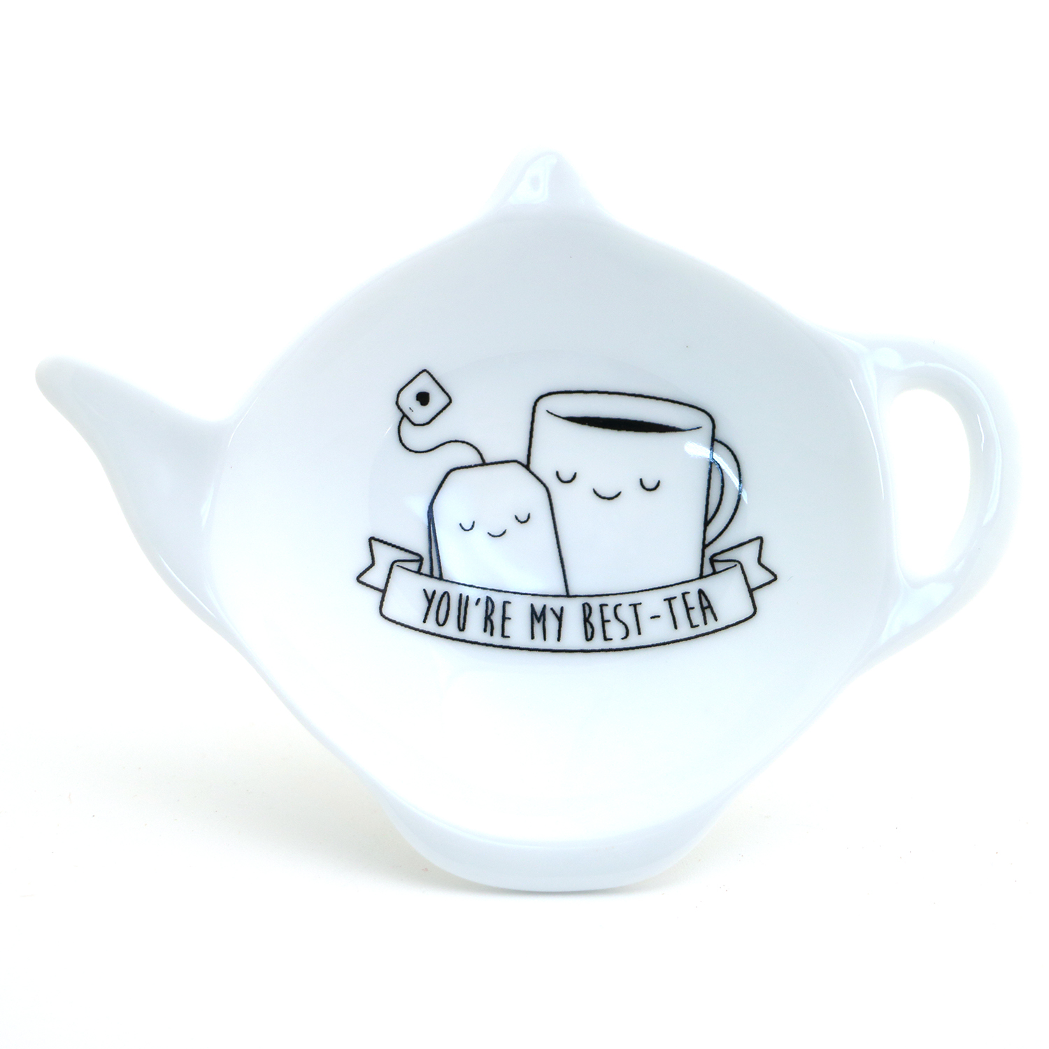 You're my Best-tea. One of a kind handmade porcelain teabag holder shaped like a little teapot featuring a sweet friendship illustration. Friends don't let friends have nowhere to put their teabags! Whimsical wordplay for pun lovers. Measures 4 x 3.5 x .5- safe to place in the dishwasher. Made to be used and enjoyed. Great friendship gift for a tea drinker.